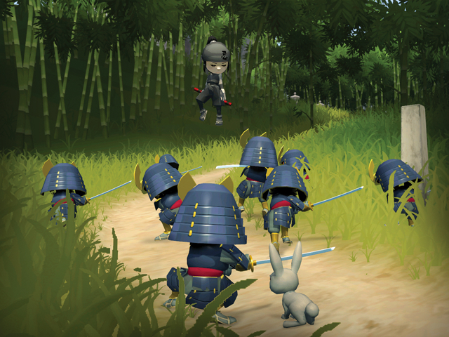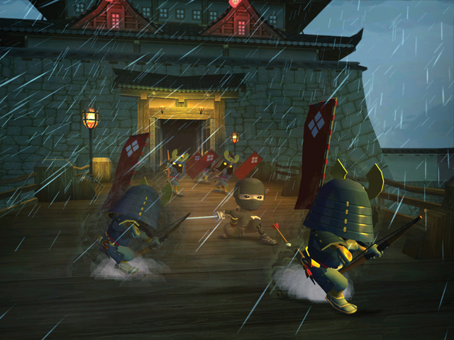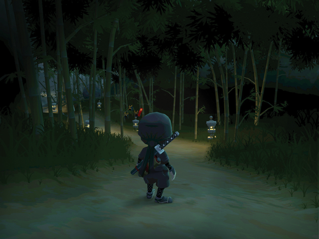 “This is an action adventure game in which players control a small ninja as he explores forest environments, fetches items for others, and fights samurai enemies. The main character uses a sword to attack and defeat enemies, and there are occasional boss battles that use life meters to measure damage inflicted. One boss character attacks with flatulence, using fans to wave green gas clouds towards the player.”