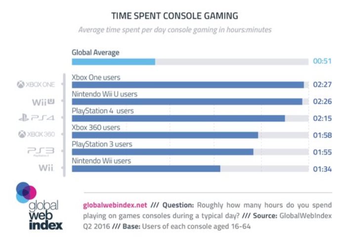 A survey conducted by GlobalWebIndex provides insight into the amount of time people are playing on consoles each day.