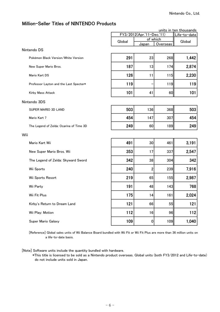 Nintendo has updated its million sellers chart. New entries include The Legend of Zelda: Skyward Sword, Super Mario 3D Land, and Mario Kart 7.