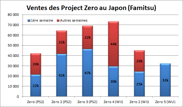 Blue bars represent Japanese sales debuts of the various Fatal Frame games. Combining the blue and red bars represents lifetime sales.