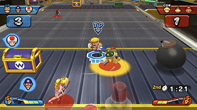 Wario Factory: Conveyor belt in a secret factory, items come down from the belt, compatible with all sports