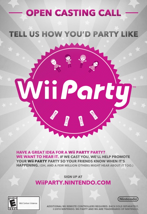Have you ever been interested in starring in a Nintendo commercial? Well, today’s your chance! Nintendo is looking for a group of people/families to be a part of upcoming TV spots. The main point of the campaign is to get participants to share their ideas for a party, and why they’re interested hosting a Wii Party party. You can check out additional details on the flier below, but be aware that today’s the last day to enter.