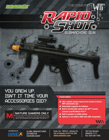 LOS ANGELES, CALIF., June 2, 2010 — Innex Inc. announced today that it has secured distribution rights for the first shooting peripheral in history intended for mature video game players only. The simulated machine gun will feature a warning label and is designed exclusively for gamers aged 17 and older.