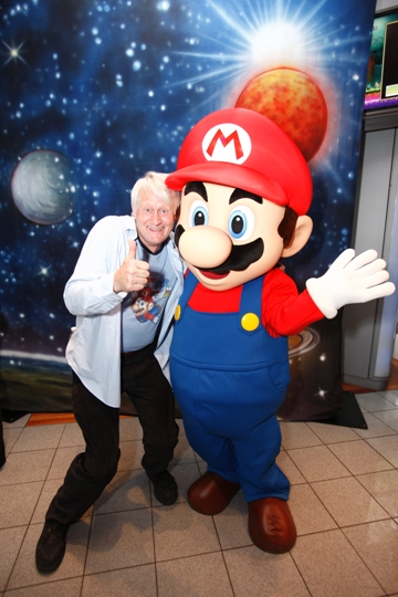 Charles Martinet, the voice of Mario, poses with the Mario character at an exclusive launch event celebrating the upcoming launch of the Super Mario Galaxy 2 game at the Nintendo World store in New York on May 21, 2010. Super Mario Galaxy 2 launched May 23, 2010.