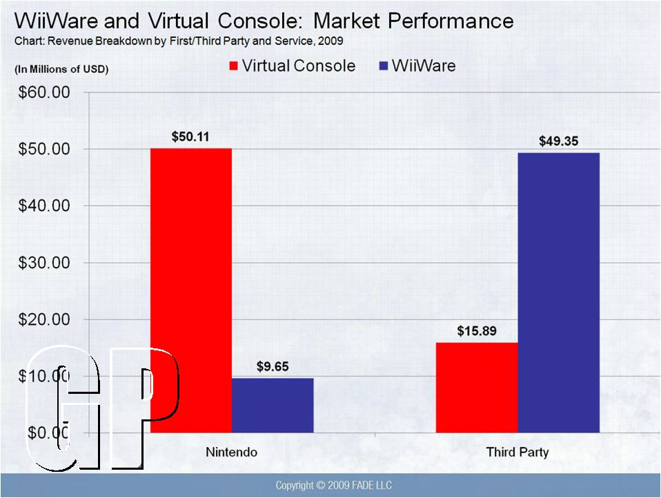 February 22, 2010 – Forecasting and Analyzing Digital Entertainment, LLC (FADE) has released its annual report for 2009 for Nintendo’s WiiWare and Virtual Console services. FADE estimates that the two platforms combined for $125 million in revenue in 2009, with the holiday rush just giving Virtual Console the edge over WiiWare ($66 million to $59 million).