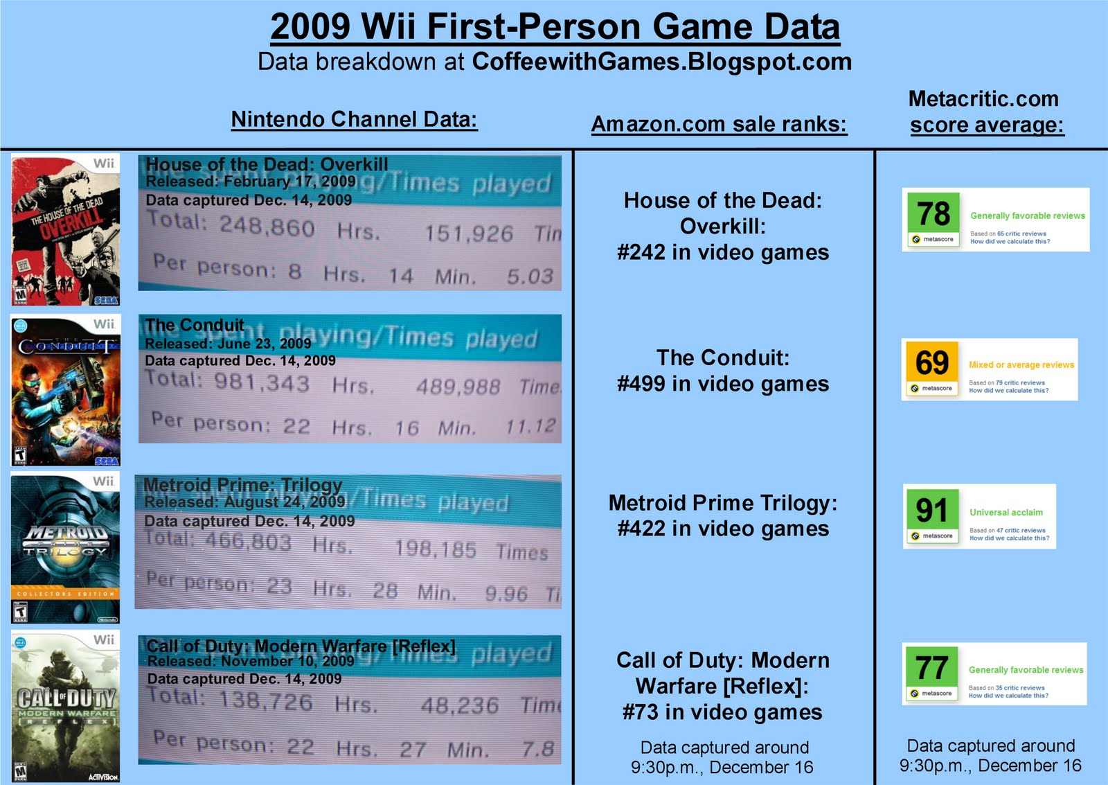 The first column shows data from the Nintendo Channel, the second column has the rankings of the games from Amazon, and the third column is the title’s Metacritic average. By the way, the Metroid Prime games technically aren’t in the FPS genre, but they do contain FPS elements!