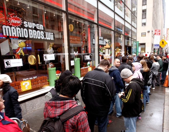 Eager fans of all ages flock to the Nintendo World store in New York on Nov. 14, 2009, to be among the first to experience the New Super Mario Bros. Wii game, the highly anticipated title that lets up to four people play together for the first time in the beloved franchise’s history. New Super Mario Bros. Wii launches on Nov. 15, 2009, for the Wii console.
