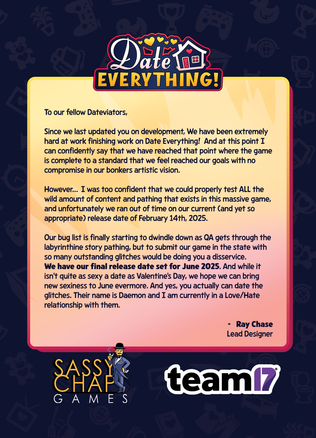 Original: Just ahead of its planned launch, Team17 and Sassy Chap Games are delaying Date Everything. The game will now come to all platforms, including Switch, on February 14, 2025.