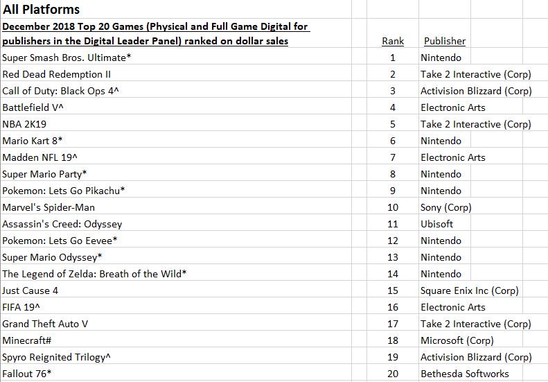 NPD Group has released a listing of the top twenty best-selling games in the U.S. for the month of December 2018. The results can be found below.