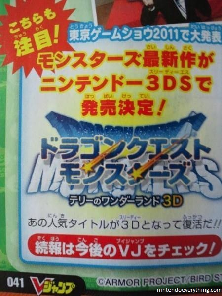 It appears that V Jump has revealed Dragon Quest Monsters 3D, a remake of the 1998 Game Boy/Game Boy Color title, for the 3DS. The original game is also known as Dragon Warrior Monsters.