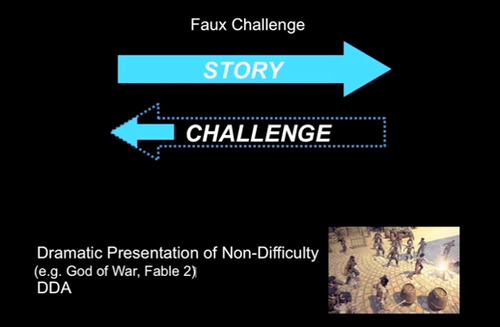 The larger outline represents the challenge they are attempting to convey to you (e.g. “You just killed a huge God! Good work!”), and the smaller filled-in arrow is how hard the action actually was. (he extrapolates to how this effects the traditional storytelling of a game, whereas I will not)