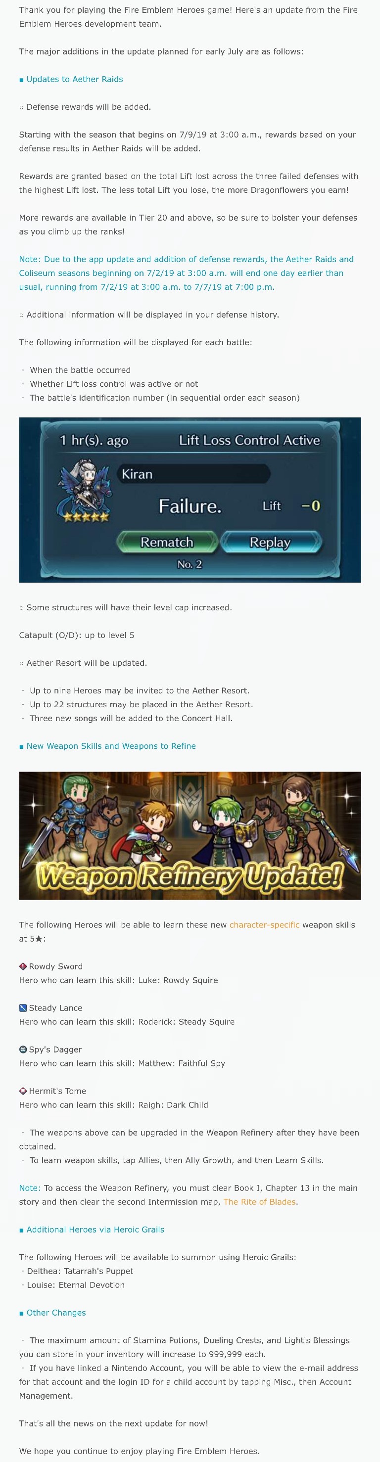 Nintendo and Intelligent Systems have announced a new version 3.7.0 update for Fire Emblem Heroes. It’ll be going live in early July, and will involve Aether Raids as well as new weapon skills and weapons.