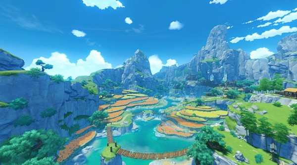 At the northernmost point of Liyue, hidden between the hills and the bamboo forests sits Qingce Village. White rolling clouds that sit in the valleys between the mountains are embellished with row upon row of crescent-moon water paddies. When the wind blows, the ripples in the water give off an array of colors.