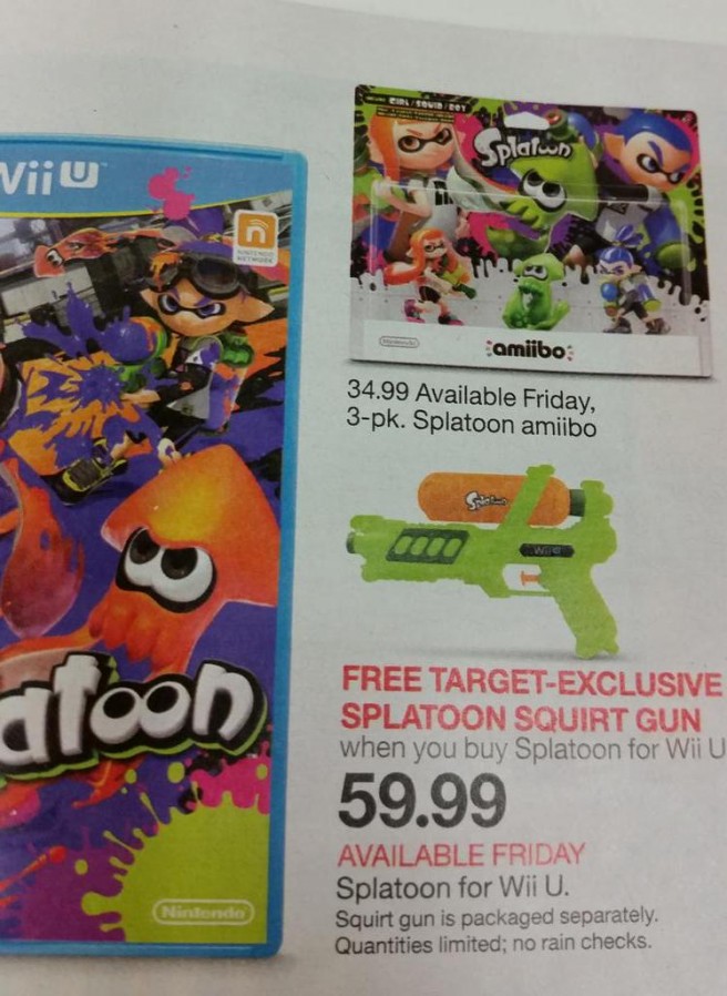 Well, this is certainly one of the more unique pre-order bonuses I’ve seen in a while. When you buy Splatoon at Target, you get an exclusive Splatoon-branded squirt gun for free as long as supplies last.