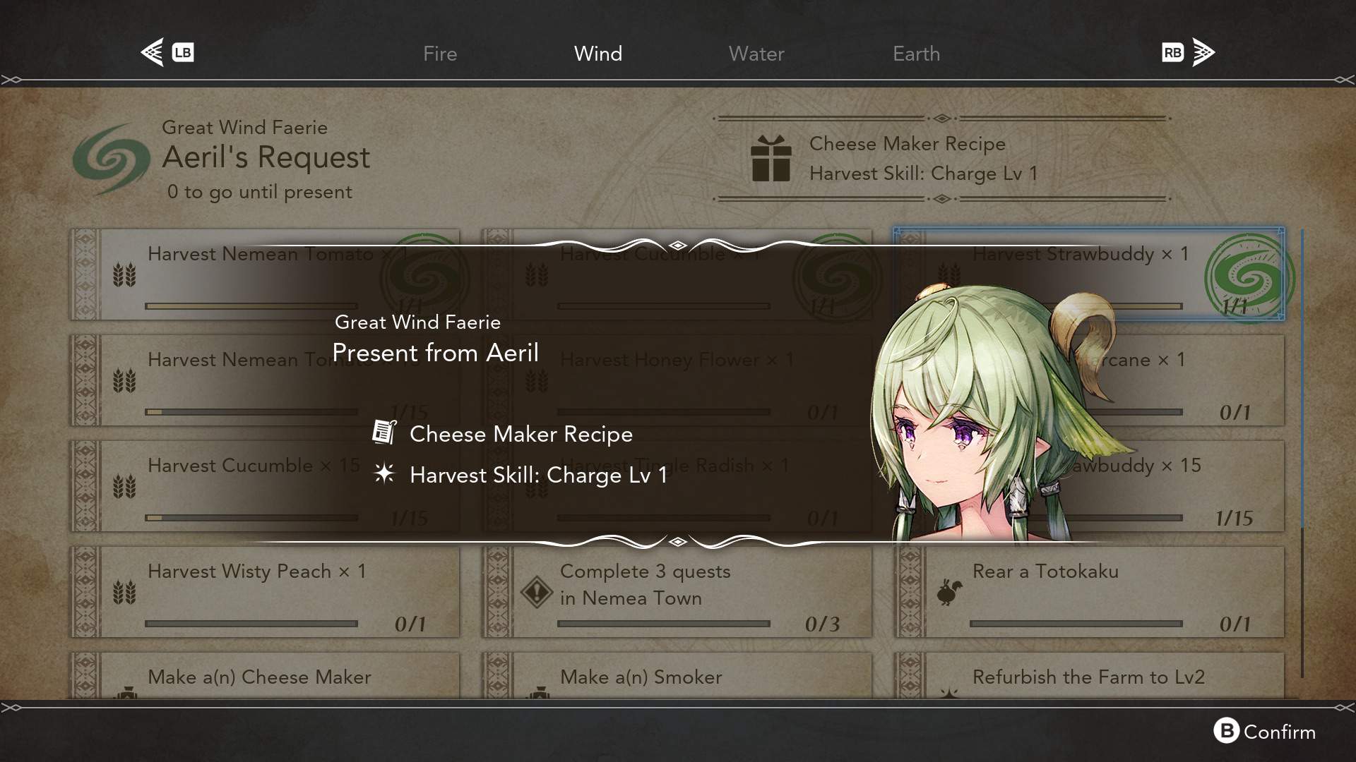 Next, let’s take a look at an activity you can undertake in your daily life: Faerie Orders. One day, a fire faerie appears at your home. It seems to have something to do with the Seaslight, and claims that other types of faerie exist too. It says that it will help you work the fields and gives you access to Faerie Orders. You can check Faerie Orders from the Faerie Book in your home.