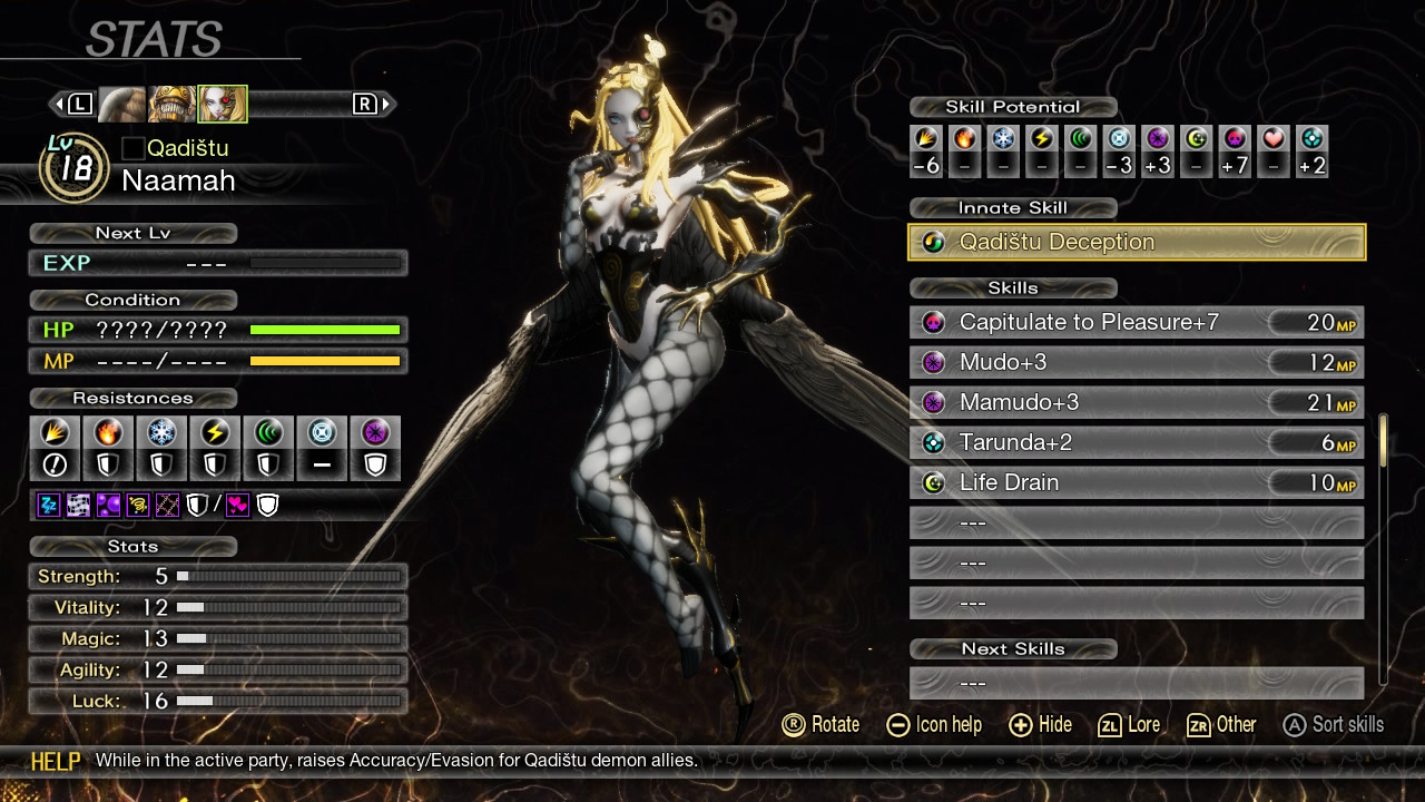 Namaah is your first encounter with the Qadištu, and she is a respectable level 18, which will be slightly higher than the other demons you’ll have encountered on your journey through Netherworld up to this point. She’ll start the battle off with Capitulate to Pleasure, inflicting Charm on your entire party, before focusing on single targets with Mudo, occasionally pausing to gather Magatsuhi or hit a character with Tarunda. She also has access to Mamudo but will use this sparingly, and it’s uncommon for her to use Life Drain. She has two actions per turn by default.