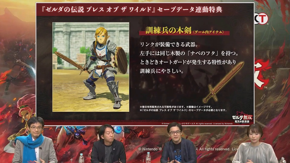 Outside of news about Impa, Koei Tecmo has confirmed a save data bonus for Zelda: Breath of the Wild. If you own that game, you can obtain Trainee’s Wooden Sword for Link. Those that don’t have any save data may be able to purchase it at a later date.