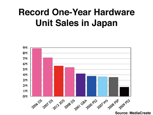 This chart shows record one-year hardware unit sales figures in Japan. As you can see, Nintendo 3DS sold more than 5.5 million units in 2012 amid the social phenomenon of smart devices. In fact, this platform was the only one to break the five million mark except for Nintendo DS in 2006, 2007 and 2008. Considering the sales pace so far and the upcoming software lineup that includes Monster Hunter and Pokémon, Nintendo 3DS is progressing at a fast enough sales pace to aim to sell five million units in Japan yet again.
