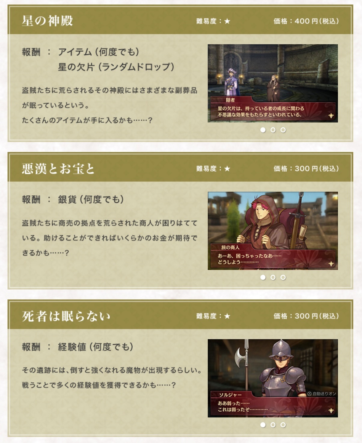 Fire Emblem Echoes’ first DLC is planned for April 20 in Japan. First, players can receive a one-time reward of the “Boots” item for free. Other than that, paid DLC is as follows: