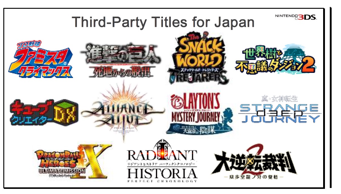 These are first-party games that were released by Nintendo in Japan and games developed and sold by publishers in Japan that will be distributed by Nintendo in the American and European markets.