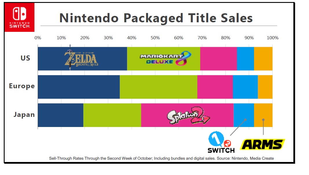 This graph shows a regional breakdown of sell-through rates for five Nintendo titles. For Japan, the most impressive performer to date has been Splatoon 2. For Europe and the US, it has been The Legend of Zelda: Breath of the Wild. Worldwide, it has been Mario Kart 8 Deluxe with a strong selling. Each region shows different trends, but that said, we can see that no single title is monopolizing the market in any region.
