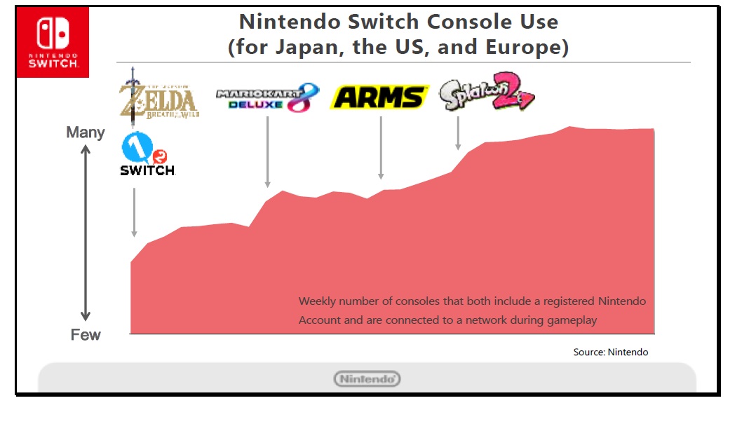 Our message at the financial results briefing in April focused on expanding the energy from the launch of Nintendo Switch and on the importance of maintaining its buzz throughout the year ahead, to maximize the installed base. Two new Nintendo titles went on sale in March at the same time as the Nintendo Switch launch, The Legend of Zelda: Breath of the Wild and 1-2-Switch. This was followed by the April release of Mario Kart 8 Deluxe, then ARMS in June and Splatoon 2 in July, generating non-stop consecutive release with titles that let you have fun with groups of friends or acquaintances. Our goal was to further promote longer play on Nintendo Switch.