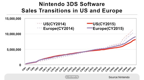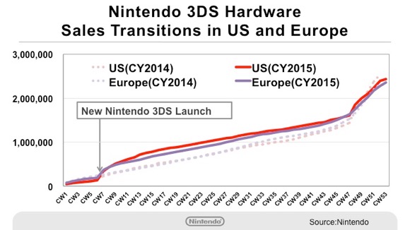 This graph shows the comparison between the Nintendo 3DS hardware sell-through numbers from 2014 and 2015 in the US and European markets.