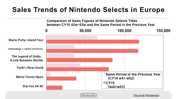 The red bars in this graph show the sell-through numbers of reduced-price titles called “Nintendo Selects,” which we sold in Europe starting in October last year.Also, the gray bars represent the sell-through numbers of the same titles during the same period in the previous year, showing a comparison between the two figures.