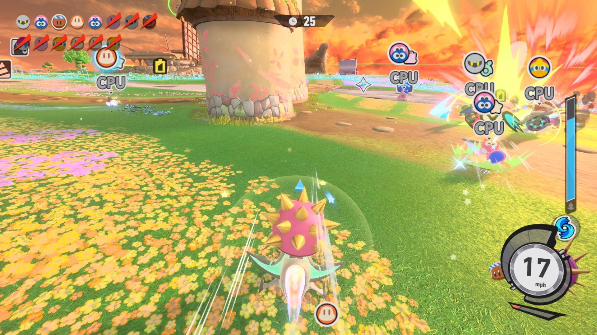 Kirby Air Riders is also different than other racing games in that you don’t need to manually accelerate. Instead, increasing your top speed in a race comes from not only how well you play to the strengths of your setup, but also how you engage with the game’s other systems. Riders can spin attack into enemies, resulting in a speed boost, and they can also copy their abilities once in range. These abilities generally make your racer faster when utilized successfully, whether that’s by slashing into foes with a sword (gaining momentum after each hit) or drilling underground before launching into the air. Speed is also gained by using the Boost ability, which actually involves slowing down your rider (sometimes to a complete stop) in order to charge up and launch off along the track. This is also how the game lets players drift around tight curves. Players can also slipstream behind enemies for an additional speed boost.