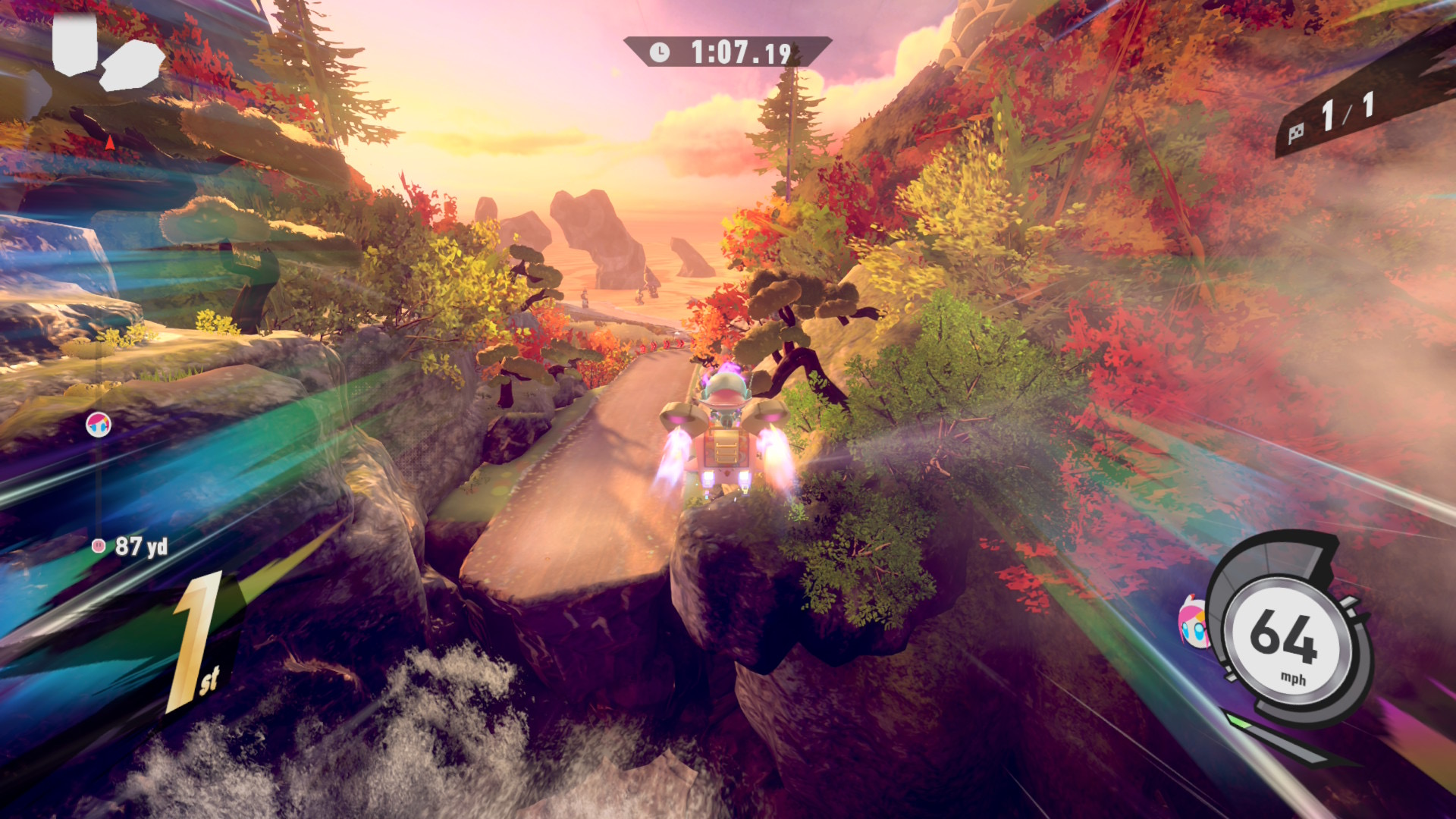 I had fun with City Trial mode in short bursts. The first phase, in which everyone is zipping around Skyah for a few minutes, is a great time! The map is well-designed, with tons of secret areas to uncover, and traversing around it – whether by ground or by air or by grind rail – is a blast. Nothing makes the dopamine receptors fire off like breaking stuff and watching my racer suck up colorful powerups to get faster and more nimble. It’s fun competing against others and trying to destroy their machines, and I love the concept of what’s essentially a bite-sized battle royale mode.