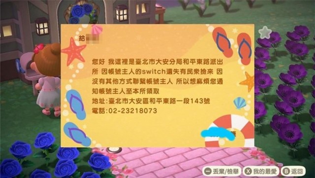 “Hello. This is the police station at East Helping Rd, Daan branch, Taipei City. The Switch has been parted from its owner and was turned in. We do not have other means to contact the owner, so please help us and reach out on our behalf so they can recover it.”