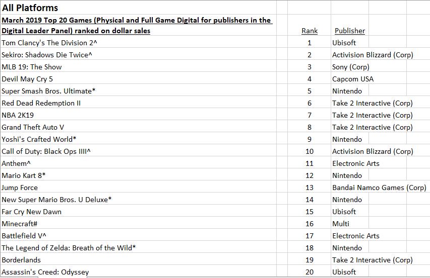 NPD Group has released a listing of the top twenty best-selling games in the U.S. for the month of March 2019. The results can be found below.