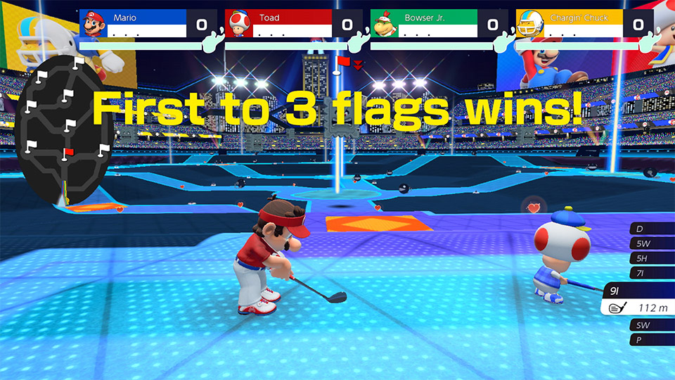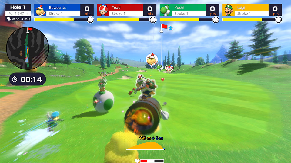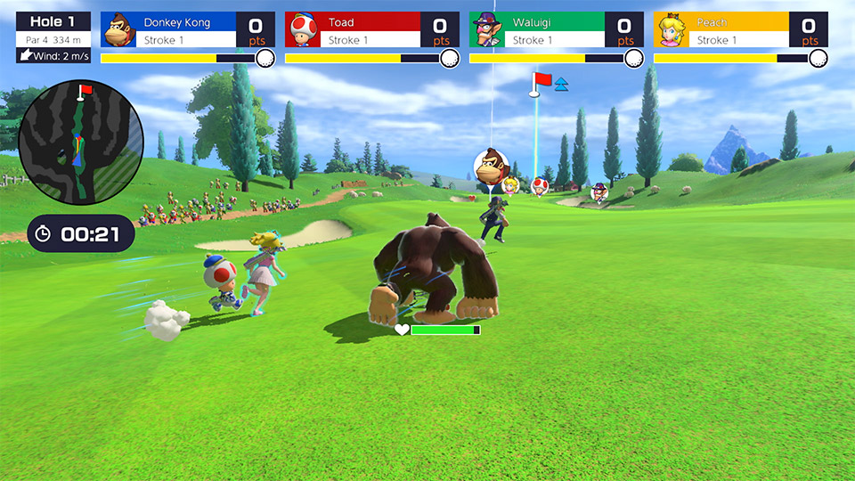 In Speed Golf, tee off in unison and race through the course to sink your ball first. Collect items to regain stamina and avoid the course’s various hazards as you sprint to the ball. You’ll need more than technique to come out ahead in this fast-paced mode – use special dashes and shots to give your opponents the run around and swing victory in your favor!