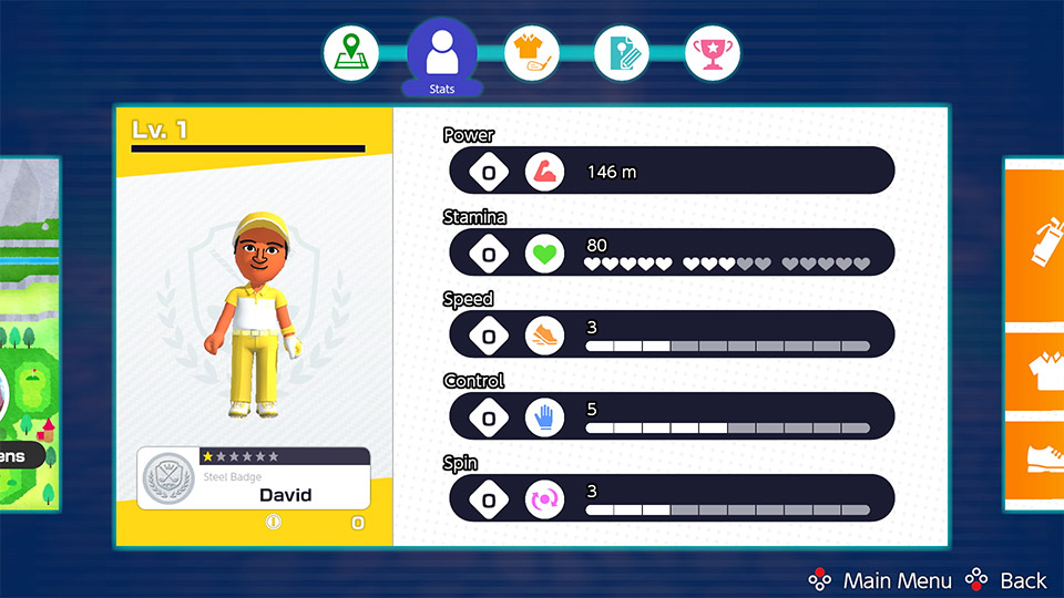 Stay ahead of the game by using your tournament winnings to buy new clubs and outfits. As you progress, you’ll gain experience to level up your character. Spend the points you’ve earned to upgrade different stats, such as power and running speed, and train your Mii character the way you want!