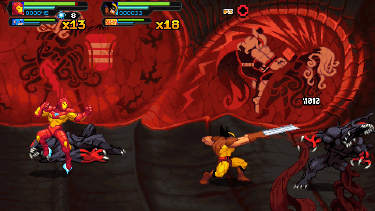 Gameplay follows the tried and true formula of the beat ’em up genre with the fun cosmic twist this time around coming in the form of a Marvel vs. Capcom-esque tag and assist mechanic. For this game, you don’t just pick one hero to fight as – you choose two. I primarily used Iron Man and Wolverine as my dynamic duo, as those are my personal favorite Marvel characters. In a stage, you can tap a button to summon your second hero to attack enemies alongside you, and if you hold the button down you can swap hero to play as your second pick. Both heroes have separate health bars, and when both heroes are KO’d, you have to start the stage over. There are plenty of health food that can be found hidden within stage obstacles, as is genre tradition, and there are various different enemy types to fight off against, including A.I.M scientists, Annihilus’ bug army, sentinels and symbiotes all with unique attack patterns and weaponry players will need to adapt to on the fly. Each hero has a standard combo string, a dodge/block button, and a unique attack button. Iron Man shoots out repulsor blasts, but they are limited, and Tony won’t hesitate to tell you when his arc reactor needs to cool off. Wolverine leaps towards the enemy and grabs them, ripping into them with his claws as the player mashes the attack button. Some characters can fly after jumping by hitting the jump button again, and every hero has unique air attacks too. This is useful against enemies that stay primarily airborne. All heroes have an EXP meter, and level up after a stage. The level cap is at 10, but characters only level up as you play them so if you’re like me and chose not to play as She-Hulk or Silver Surfer, you’ll have a lopsided roster of some fighters at their strongest point and some at their weakest.