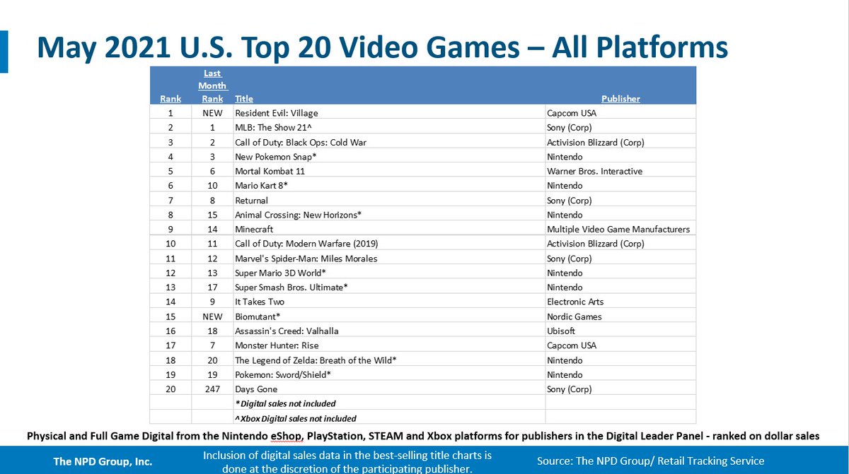 NPD Group has released a listing of the top twenty best-selling games in the U.S. for the month of May 2021. The results can be found below.