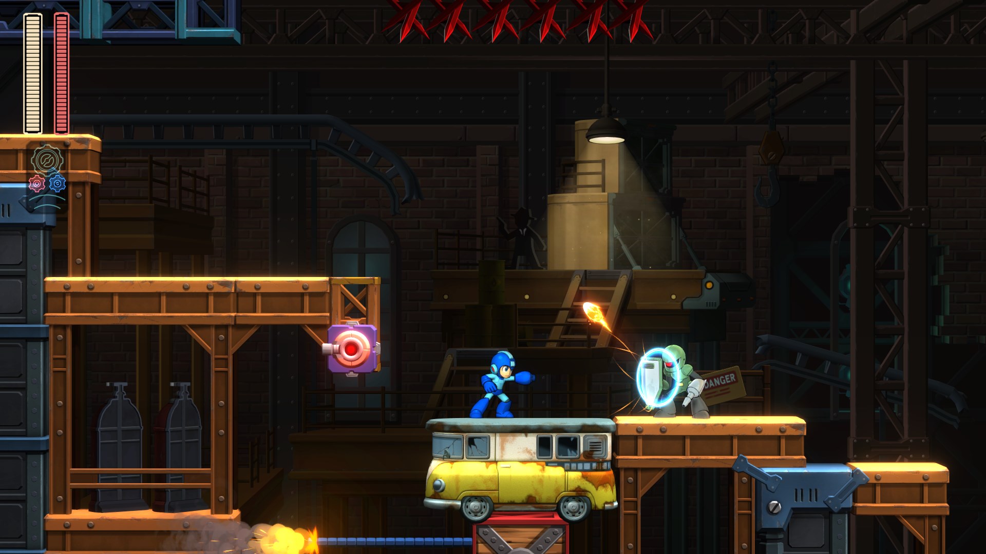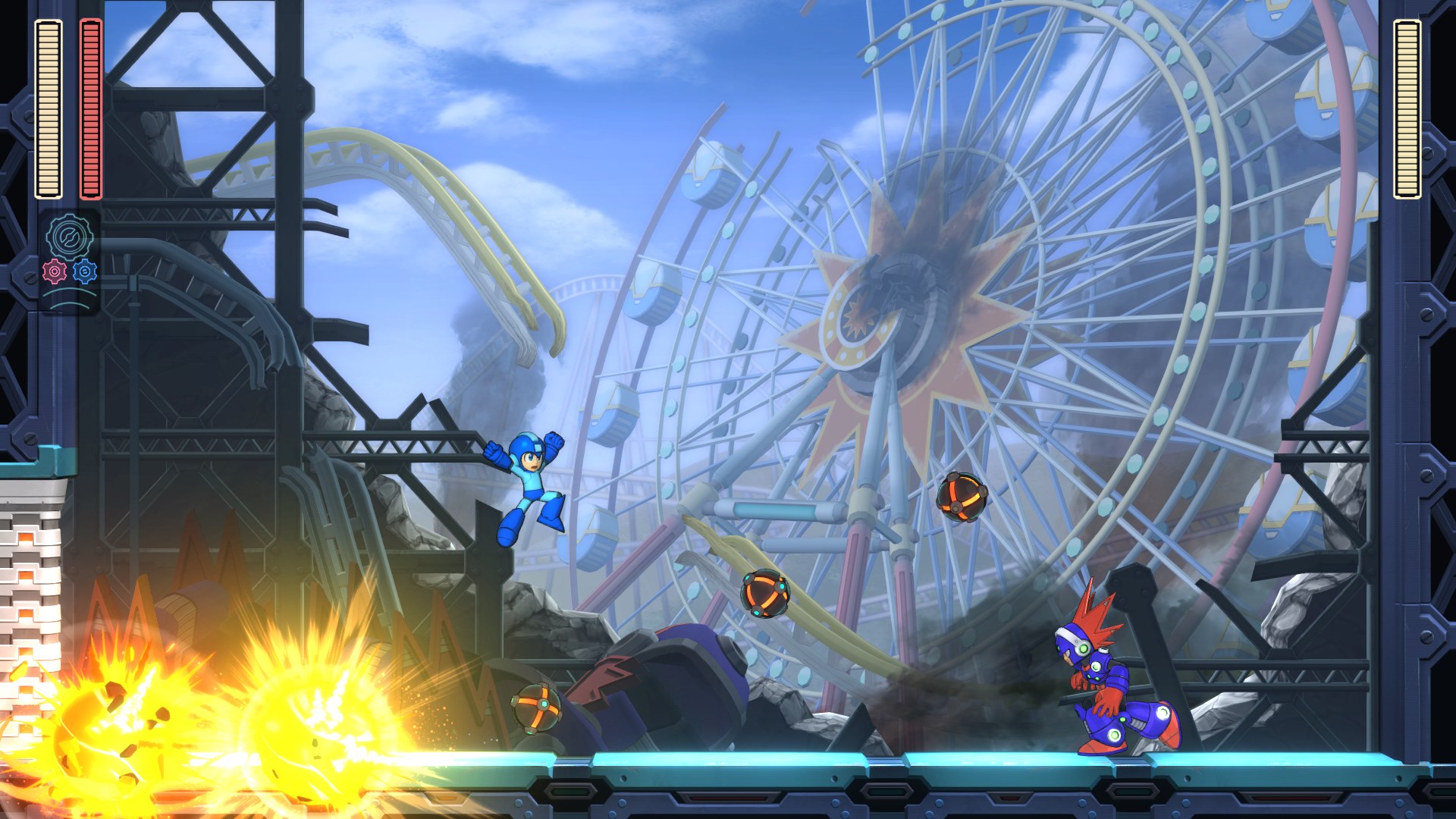 Just when you think things couldn’t get more off the rails, you’ll have to deal with a roller coaster ride of a mid-boss. Explosive mini-bots zoom around in rockets on rails, occasionally tumbling out when they’re upside-down – so much for proper safety precautions! You can’t damage the rockets with regular buster shots, so you’ll have to get creative as you dodge dive-kicks from the falling robots and jump over the out-of-control coaster.