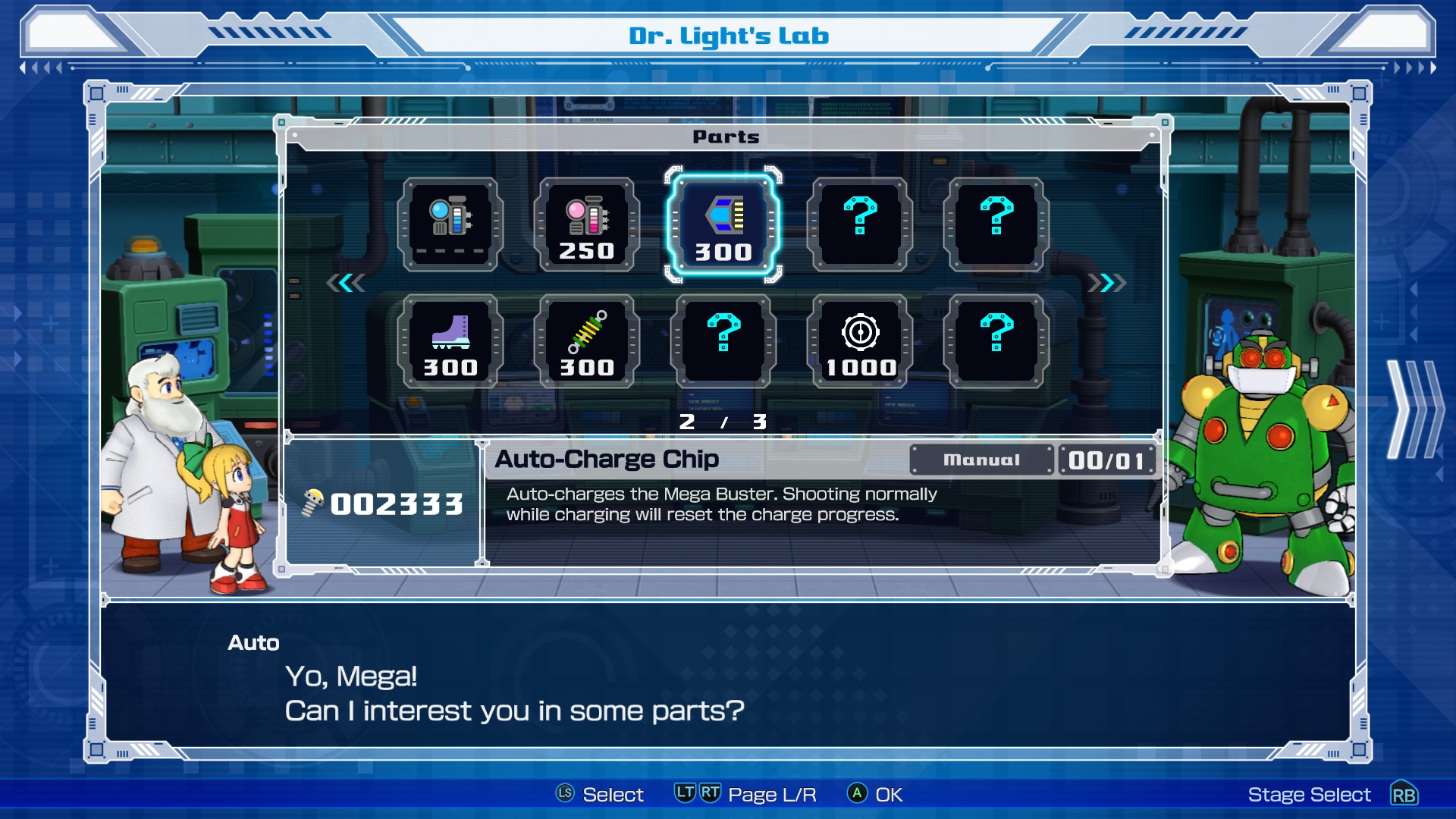 As you’re busy busting ‘bots in Mega Man 11, you’ll collect bolts dropped by enemies and scattered throughout each stage. Just like in past games, you’ll be able to use the bolts you’ve found to craft new items and upgrades at Dr. Light’s Lab thanks to the hard work of Roll, Auto, and Dr. Light himself. The aptly named Auto-Charge Chip shown above is just one of the many upgrades you can get equipped with throughout your adventure, including some icons that may look familiar to long-time fans.