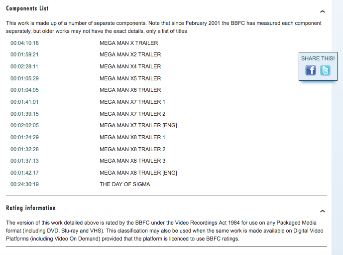 The classification first lists trailers for Mega Man X1 through X8. Additionally, The Day of Sigma is included. This was a 24-minute OVA that came with Mega Man: Maverick Hunter X in 2005. It’s thought that the videos will be featured in the “Gallery Extras” section in each or both X collections.