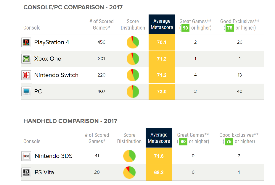 To start off, here’s a look at how Switch / PS4 / Xbox One / PC reviews compared last year, as well as a comparison for 3DS and PlayStation Vita: