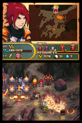 On the surface, Clash of Heroes may appear to be a simple title. After just a few minutes of playtime, however, you’ll come to realize that the gameplay is very deep. The basic setup is that the touch screen acts as your base of actions for battle while the top screen is where all enemy activity takes place. In most instances, your main objective is to wipe out your opponent’s HP with charged attacks your units will carry out after a few turns.