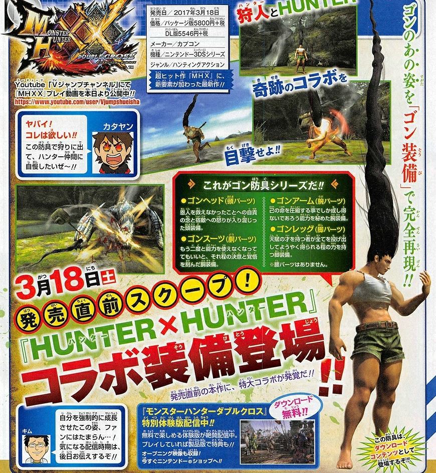 Next in the long, long line of Monster Hunter collaborations is Hunter x Hunter. Specifically, V-Jump magazine has revealed that Monster Hunter XX will get a collaboration with the popular manga/anime Hunter x Hunter. This consists of four special pieces of equipment: Gon’s head, Gon’s shirt, Gon’s arms and Gon’s legs.