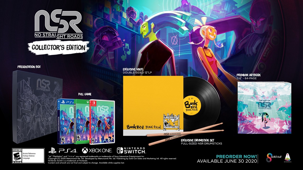 Also announced today is the No Straight Roads Collector’s Edition, which features an exclusive double-sided vinyl LP with tracks from the game’s official soundtrack, a 64-page ‘The Art of NSR’ art book, official NSR drumsticks, and a presentation box.