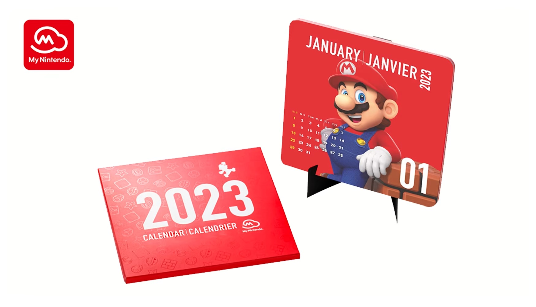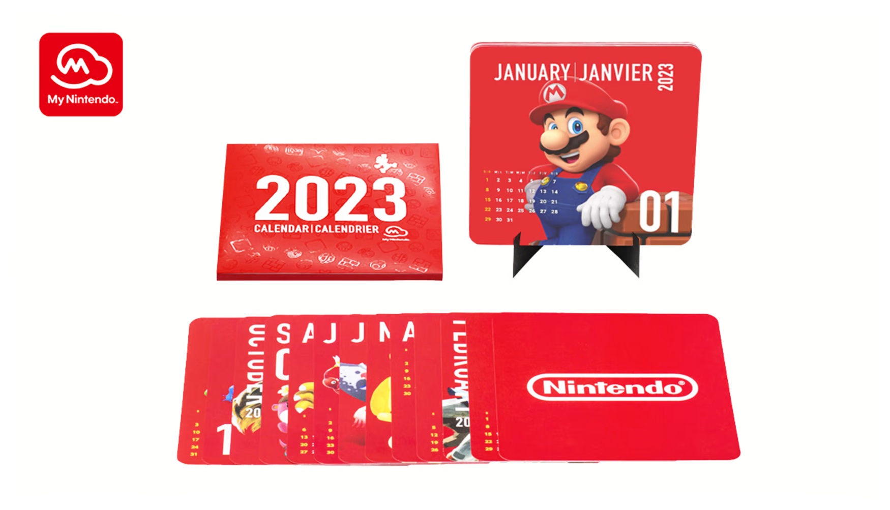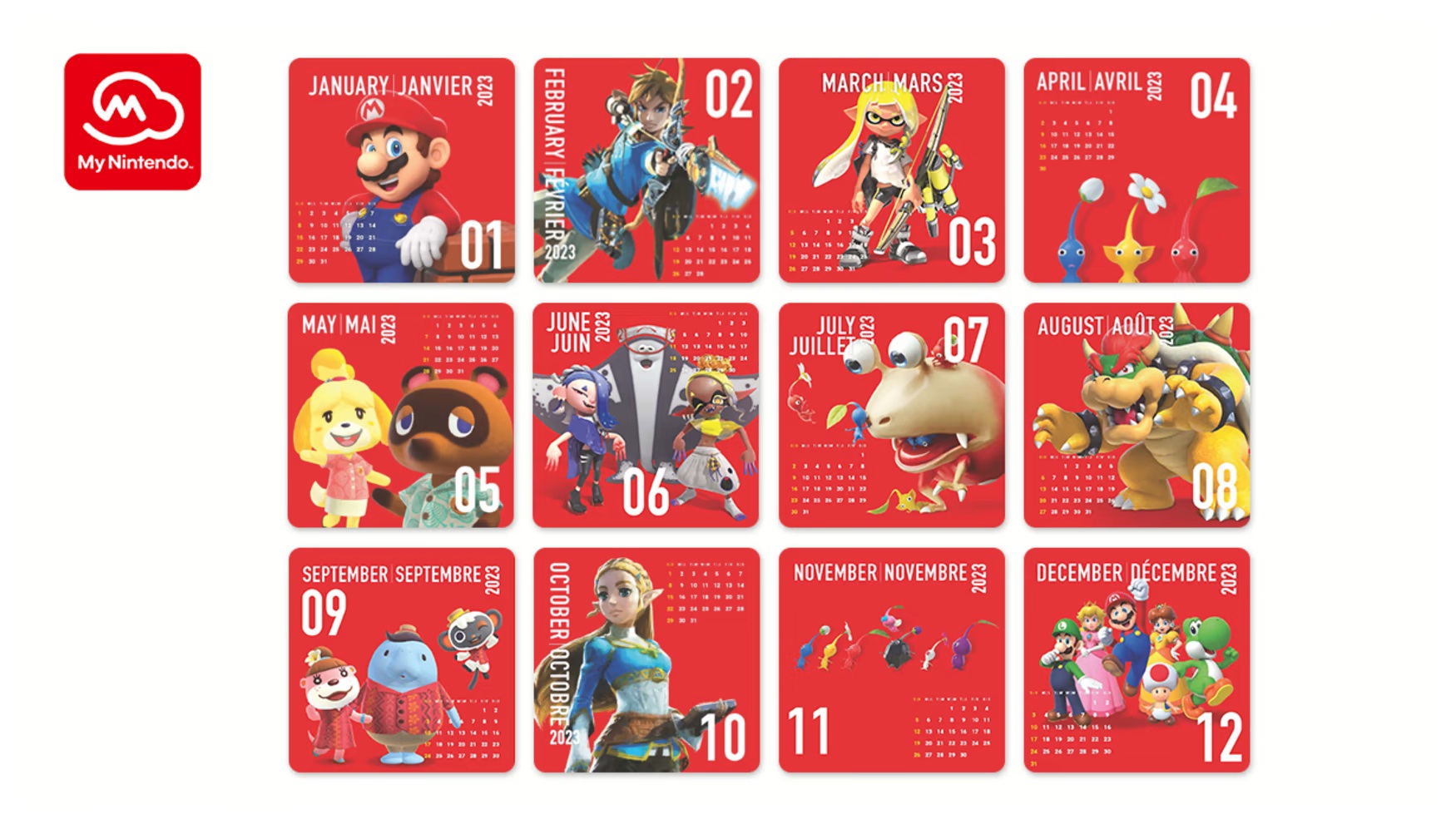 Finally, the 2023 calendar features popular characters from Switch games. Represented franchises include Mario, Zelda, Splatoon, Pikmin, and Animal Crossing. The calendar is priced at 400 Platinum Points.