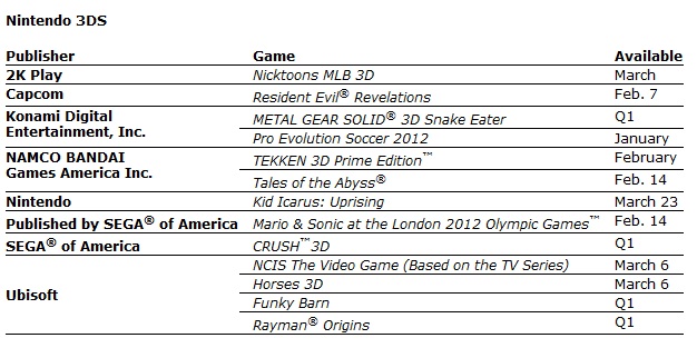 On the Nintendo 3DS system, Capcom’s Resident Evil® Revelations launches on Feb. 7. In a new chapter of the hit survival-horror franchise, players fight a new enemy and virus in 3D without the need for special glasses. METAL GEAR SOLID® 3D Snake Eater from Konami arrives in the first quarter of 2012. The game is a re-interpretation of METAL GEAR SOLID 3: Snake Eater, and offers a rich jungle world with customizable stealth and camouflage options. On March 23, the epic odyssey Kid Icarus™: Uprising soars into stores and lets players help the winged warrior Pit fight Medusa and her Underworld Army.