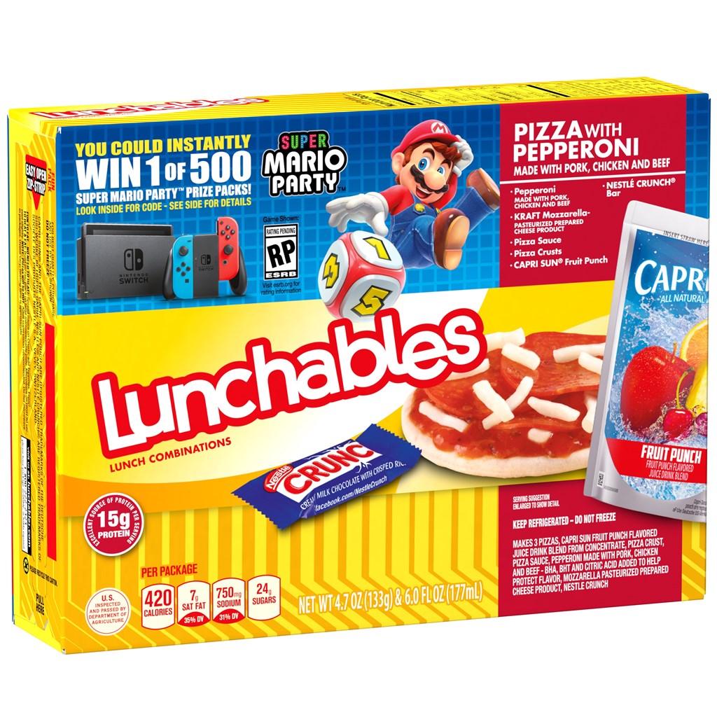 Along with the on-pack promotion, each Super Mario Party branded Lunchables box will contain a unique code to give fans a chance to instantly win one of 500 Super Mario Party prize packs in an online sweepstakes*, making lunch an even more rewarding experience. By visiting http://www.Lunchables.com/MarioPartySweepstakes, fans of Nintendo and Lunchables can enter for a chance to win a Nintendo Switch system, the Super Mario Party game, an extra pair of Joy-Con controllers, a branded Nintendo Switch carrying case and My Nintendo points. Specially marked packages of Lunchables Fun Pack and Lunchables with 100% Juice are available on store shelves nationwide now through December – just in time for the holidays.