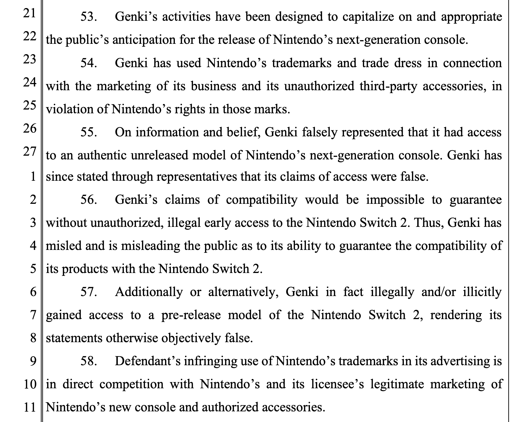 Additionally, Genki did not have access to a Nintendo Switch 2 unit, despite initially claiming otherwise. Nintendo argues that “claims of compatibility would be impossible to guarantee without unauthorized, illegal early access to the Nintendo Switch 2” and therefore the company “has misled and is misleading the public as to its ability to guarantee the compatibility of its products with the Nintendo Switch 2.”