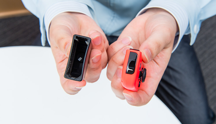Mr. Ogasawara: In the back we’ve affixed reflective tape to serve as a marker. The Joy-Con emits a beam of invisible infrared light that is reflected back by these markers, enabling the camera to read their movement. By making it like this we can read the movement data without needing any additional electronic components.