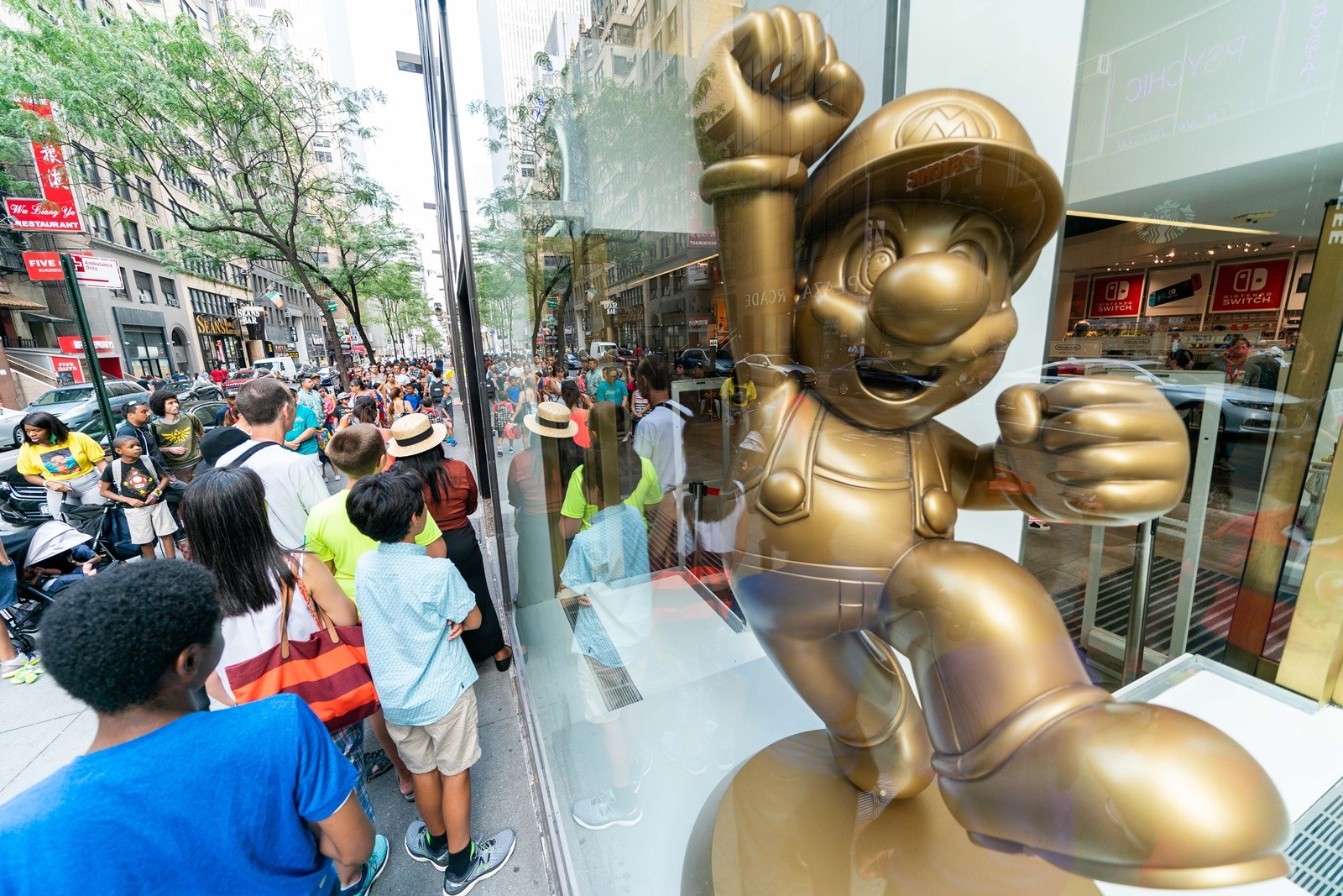 In this photo provided by Nintendo of America, families line up to celebrate the start of the back-to-school season during a special event at the Nintendo NY store in Rockefeller Plaza on Aug. 18, 2019.