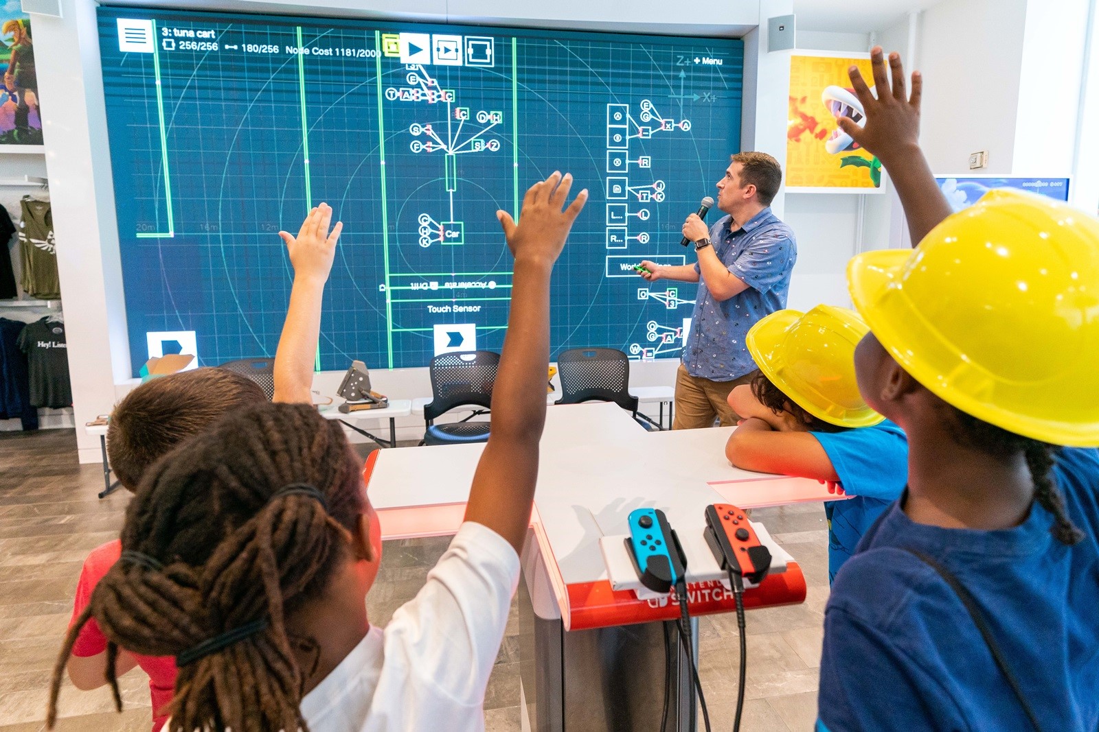 In this photo provided by Nintendo of America, families celebrate the back-to-school season with a Nintendo Labo: VR Kit demonstration led by teacher Bill Vacca of Bradt Primary School in New York, showing Nintendo Labo Toy-Con Garage where players can use their imagination to invent new ways to play. Nintendo Labo: VR Kit is now available for the Nintendo Switch system.